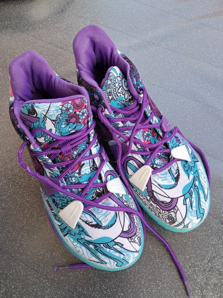 Mor renkli, yurt dışından baskılı desenlere sahip, bağcıklı basketbol ayakkabısı.