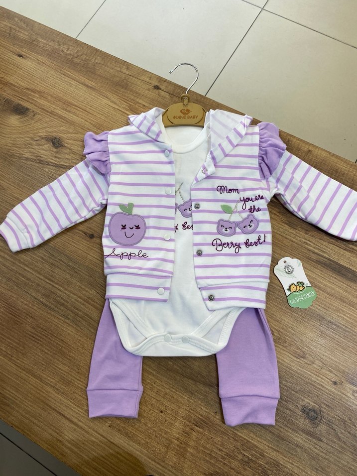 Pastel mor renkte, düğmeli ve baskılı ceket, beyaz body ve uyumlu pantolondan oluşan bebek hastane kıyafeti.