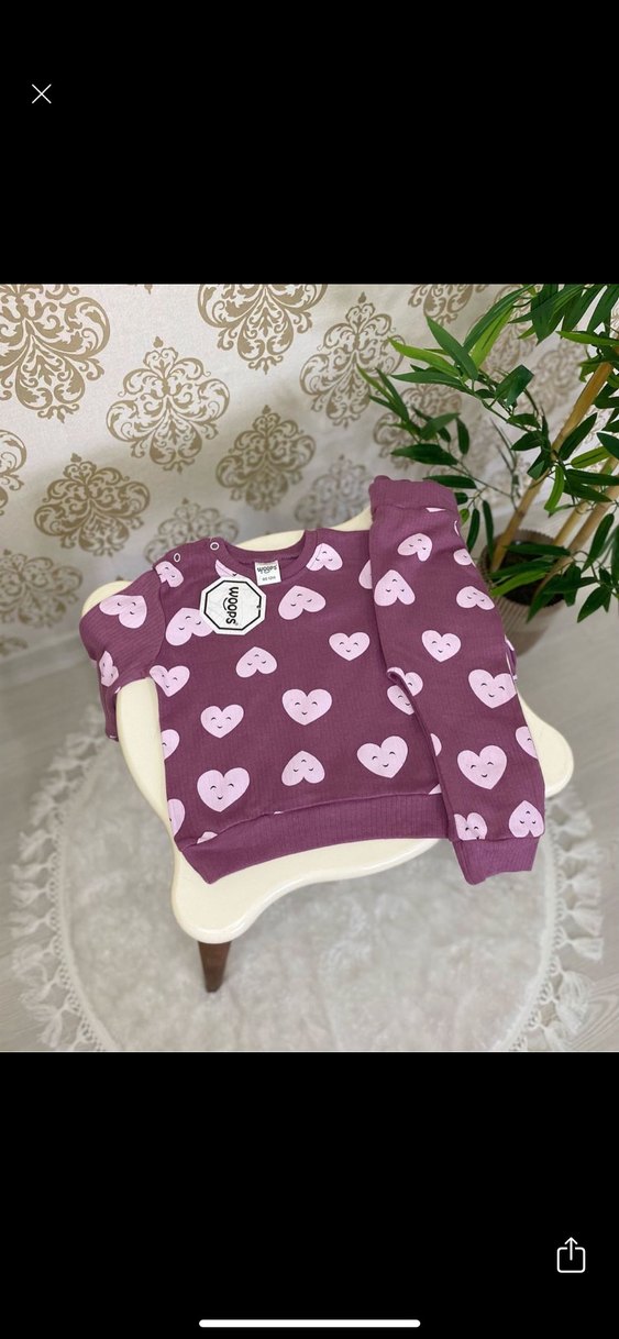 Bebek kız takımı, uzun kollu ve örgü dokuda, pastel mor renkte kalp desenleriyle tasarlanmıştır.