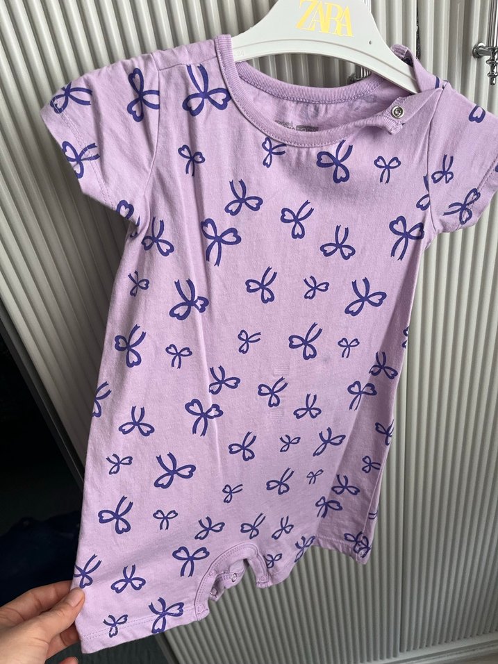 Pastel mor renkte, baskılı fiyonk desenli, kısa kollu bebek kız tulumu. Omuzda kolay giydirme için çıtçıtlı.