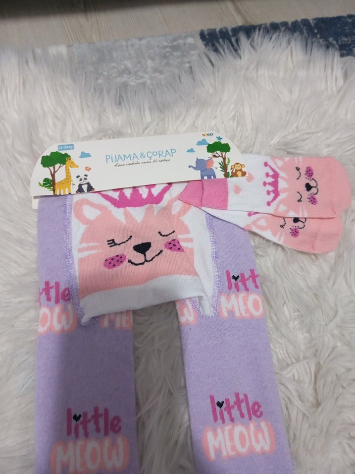 Pastel mor renkte, yumuşak polar kumaştan yapılmış, üzerinde kedi desenli ve "little MEOW" yazısı bulunan bebek külotlu Rahat ve sıcak tutar. 12, 24 ay