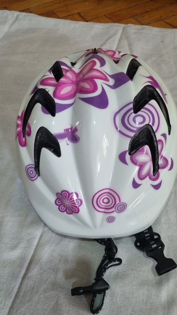 Mor çiçek desenli baskılı beyaz plastik bisiklet kaskı, siyah havalandırma delikleri ve tokalı kayışa sahiptir. Bohem, hippie ve retro tarzlara uygundur. ️dechatlondan alınmıştı.