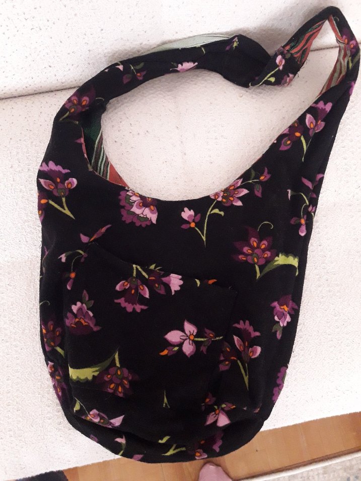 Mor baskılı, sentetik kumaştan yapılmış, bohem tarzda, tokalı kadın çantası. Günlük kullanıma uygun.