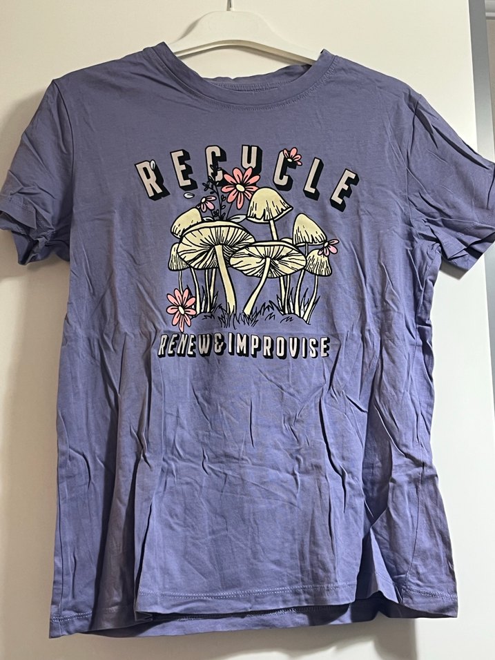 Mor kısa kollu, bol kesim tişört. Mantar baskılı ve "RECYCLE RENEW IMPROVISE" yazılı. Sentetik kumaştan, bohem ve rahat tarzda.