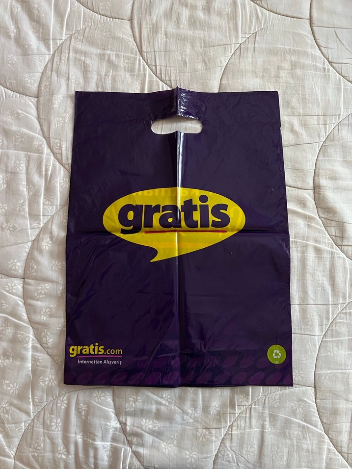 Mor renkli, üzerinde 'gratis' baskısı olan çantası. Taşıma kolaylığı sağlayan kesik kulpu bulunur. Hafif yapıda bir çantadır.