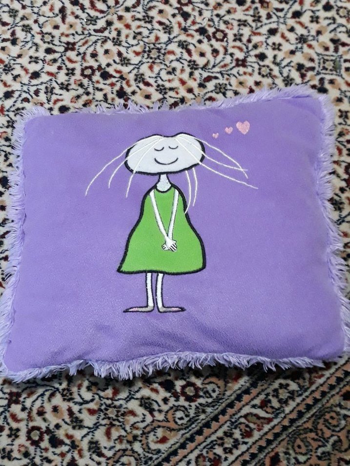 Yumuşak sentetik kumaştan, yeşil elbiseli kız ve kalp desenli mor baskılı çocuk yastığı. ️