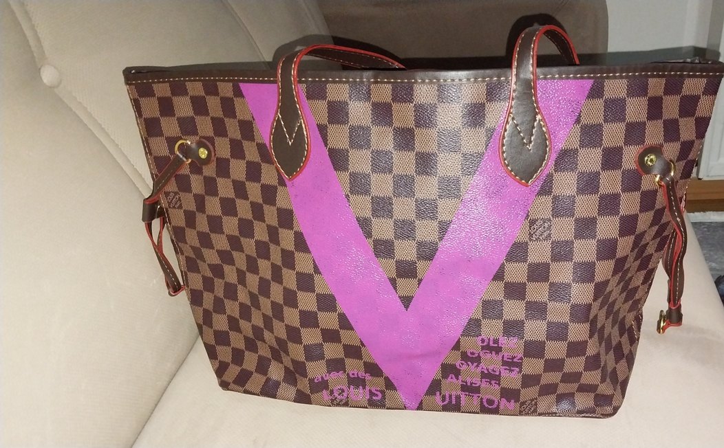 Kadın çanta, kareli deri tasarımı, parlak mor baskılı detaylar ve tokalı kulplarla Parisli avangart tarzını yansıtıyor.