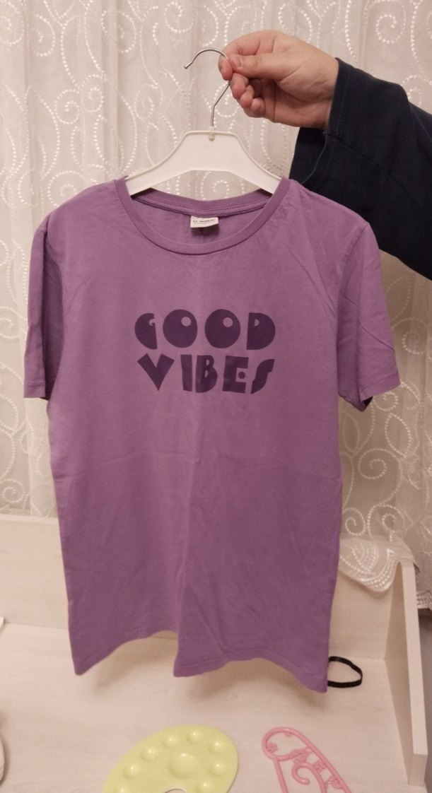 Pamuklu, mor renkli, kısa kollu ve bisiklet yaka, bol kesim erkek cocuk tişörtü. Önünde 'GOOD VIBES' baskısı bulunur.