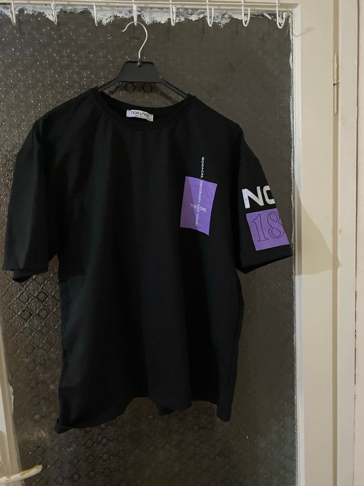 Mor baskılı detaylara sahip siyah renk, kısa kollu, yuvarlak yakalı, rahat kesim erkek tişörtü. Sentetik kumaştan, günlük kullanıma uygun.