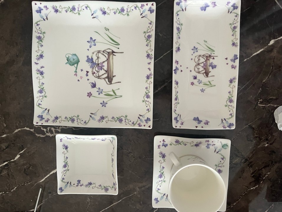 Mor baskılı, geleneksel tarzda çiçek ve bahçe desenli tabak takımı. Kare tabaklar ve uyumlu desenli bir fincan içerir.