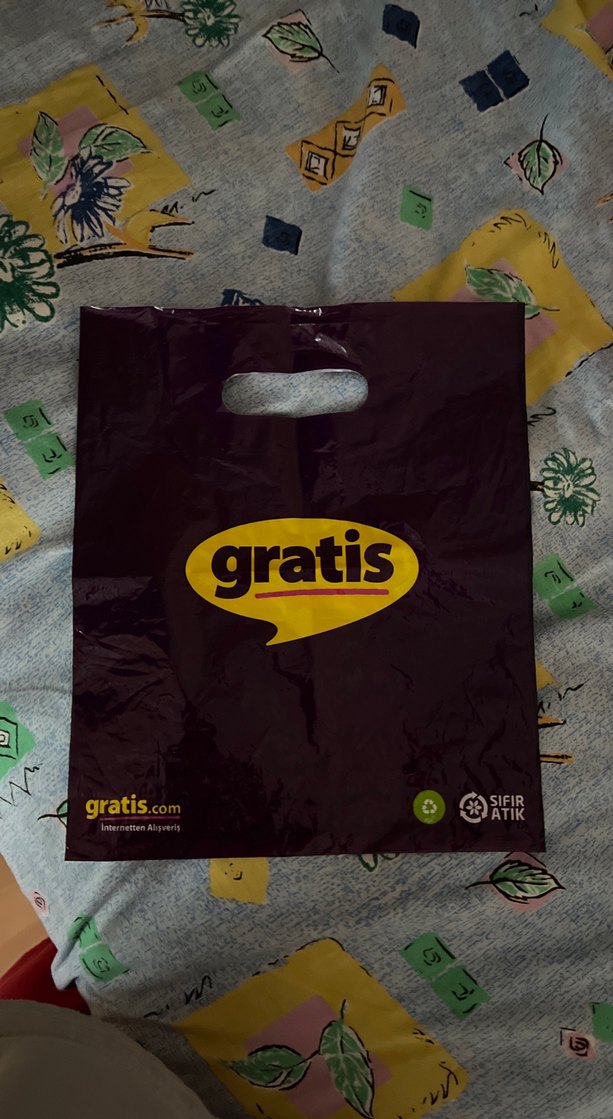 Gri renkli, baskılı 'gratis' logosu olan ve kesik saplı bebek çantası. Geri dönüştürülebilir malzeme işaretleri bulunur.