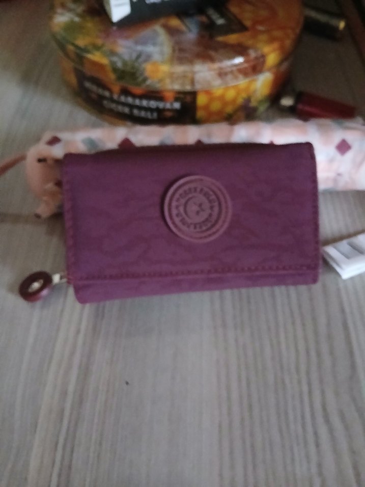 Mor baskılı desenli, tokalı kadın cüzdanı. Günlük kullanıma uygun, minimalist ve trend tarzda sentetik kumaştan yapılmıştır.