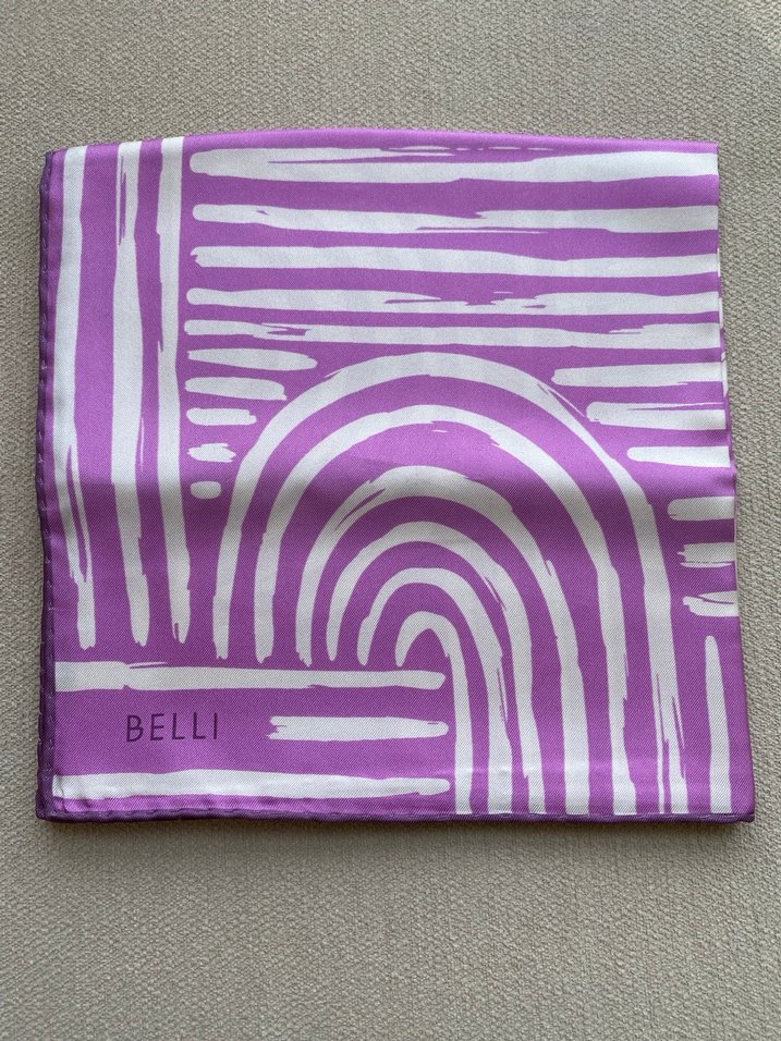 Kadınlar için ipek dokulu, pastel mor renkte ve baskılı çağdaş tasarıma sahip fular. "BELLI" markalı, bohem, hippie ve retro tarzına uygun.
