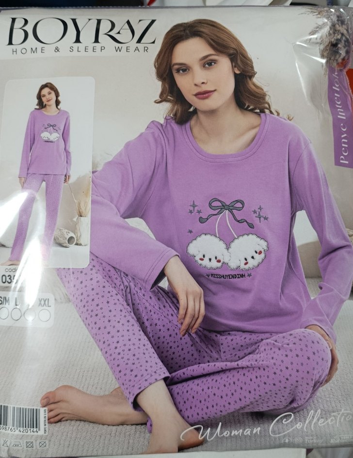 Mor renkli, uzun kollu ve bol kesim kadın pijama takımı. Üstte kiraz baskısı, alt ise nokta desenli. Boyraz Home & Sleep Wear markalı, rahat ve şık.