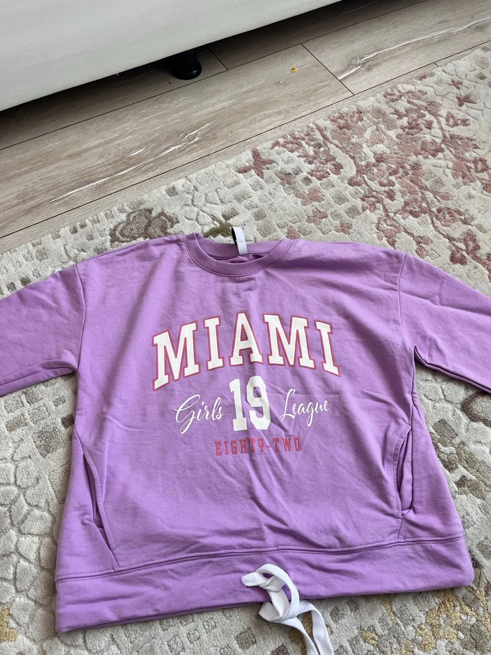 Mor pastel renkte, uzun kollu, bol kesim kadın sweatshirt. "MIAMI Girls League 19 Eighty Two" baskılı, fermuarlı cepleri ve bağcıklı alt kısmı bulunur. Pamuk kumaştan üretilmiştir.