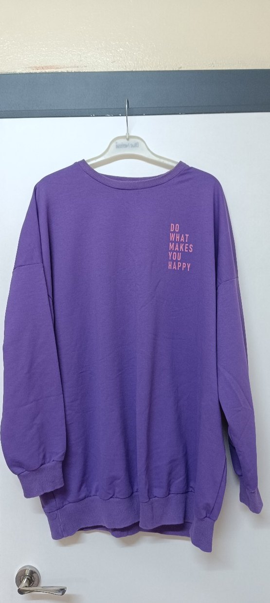 Uzun kollu ve yuvarlak yakalı mor kadın sweatshirtü, rahat kesim ve pastel tonuyla dikkat çekiyor. Göğsünde "DO WHAT MAKES YOU HAPPY" yazılı baskı bulunur. Yumuşak ve sıcak kumaştan üretilmiştir.