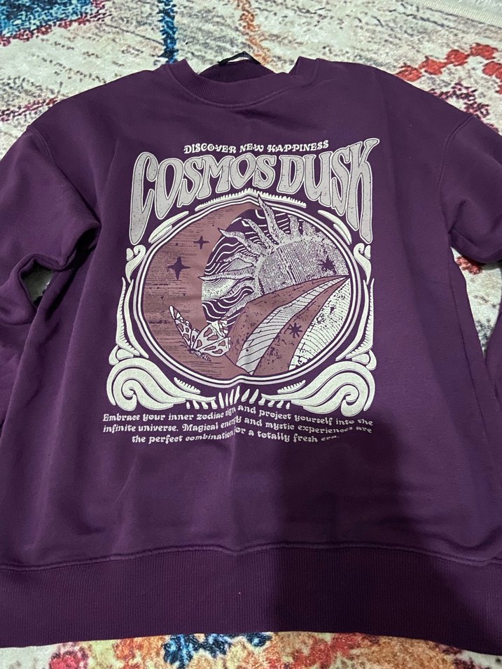 Mor renkli, baskılı, uzun kollu ve bisiklet yakalı kadın sweatshirtü, bol kesim ve günlük kullanıma uygun.