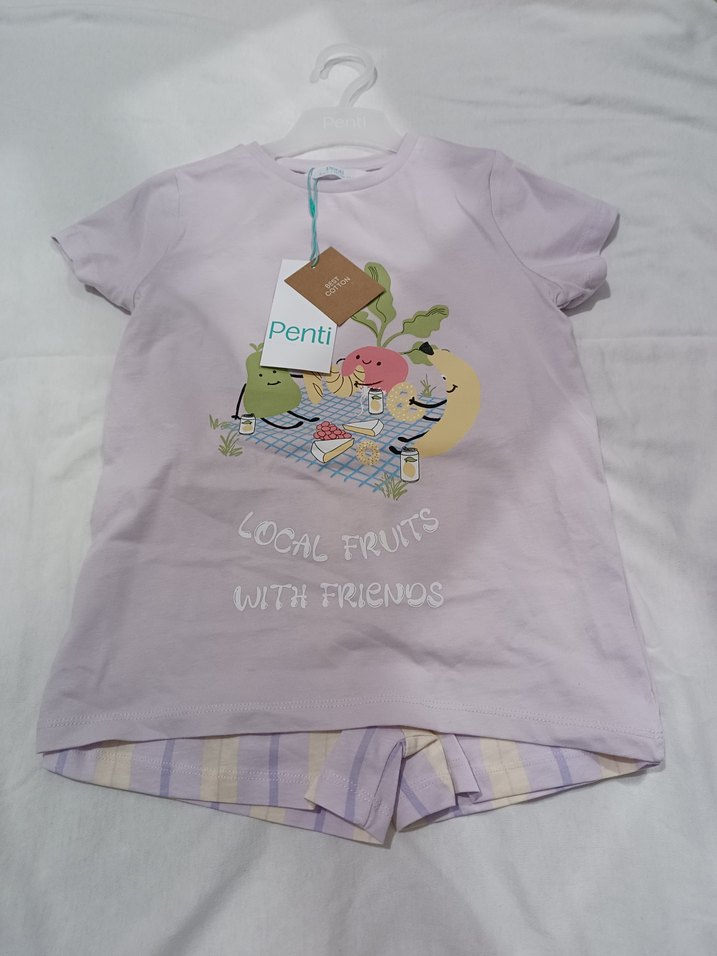 Mor pastel tonlarında kısa kollu, baskılı tişört ve çizgili şorttan oluşan bebek kız kıyafet seti, yumuşak kumaşıyla rahatlık sağlar.