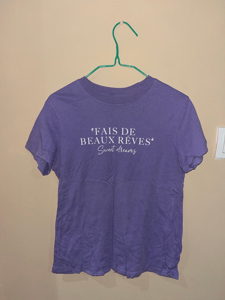 Mor, pamuklu, kısa kollu, bisiklet yaka, bol kesim tişört, Fransızca baskılı desenle şık bir sokak stili sunar.