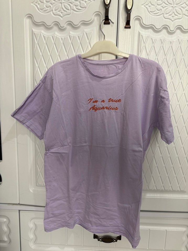 Mor renkli, baskılı kısa kollu, yuvarlak yakalı bol kesim tişört. Rahat sentetik kumaştan, günlük sokak stili için uygun.