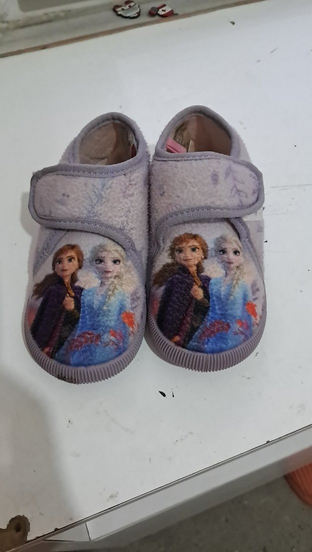 Mor renkli, yumuşak kumaştan yapılmış kız çocuk ev terlikleri, baskılı desene ve kolay giyimi sağlayan Velcro bantlara sahiptir. ❄️