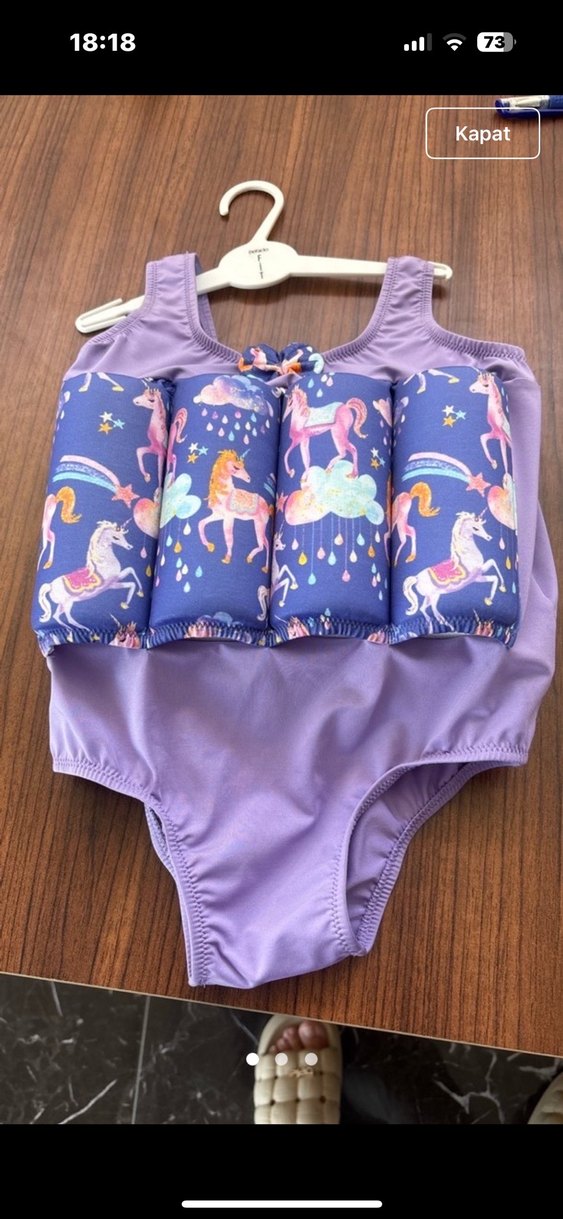 Mor renkli, unicorn baskılı, kolsuz kız çocuk mayosu. Plajda kullanıma uygun, yumuşak ve rahat kumaştan yapılmıştır.