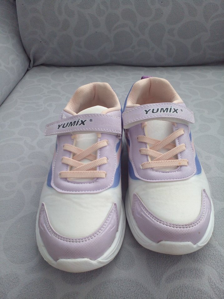 Mor pastel tonlarda baskılı kız çocuk spor ayakkabısı, cırt cırtlı ve kauçuk tabanlı. Marka: UMIX. Trendy günlük sokak stili için uygun. 3cu giyimde dar geldi