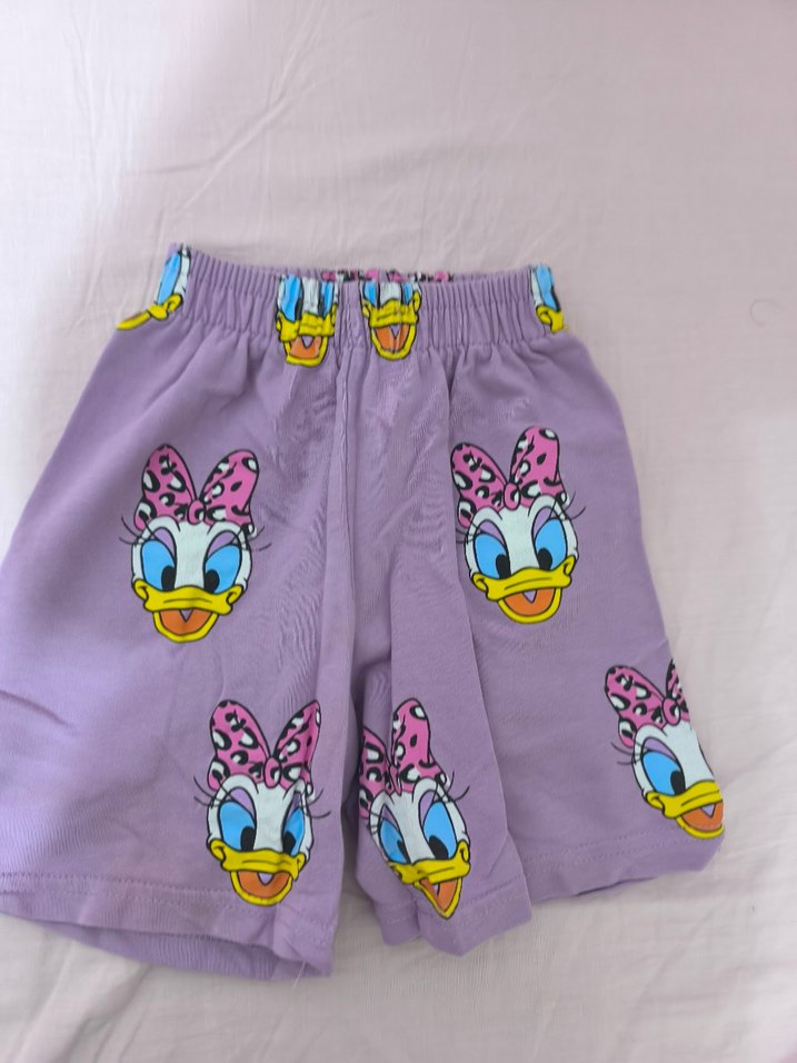 Mor renkli, sentetik kumaştan yapılmış, bol kesim kız şortu. Renkli baskılı Disney karakterleri ve düğmeli detay içerir.