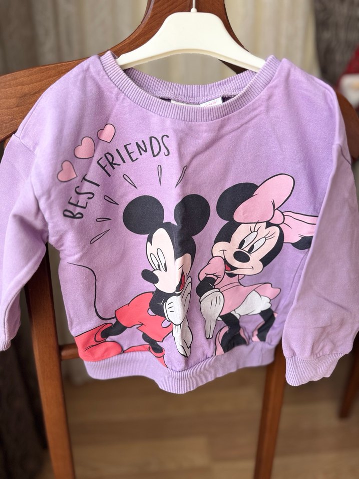 Mor renkte, uzun kollu ve bisiklet yaka kız sweatshirtü. Mickey ve Minnie baskılı, "Best Friends" yazılı.Defacto marka 24-36 ay