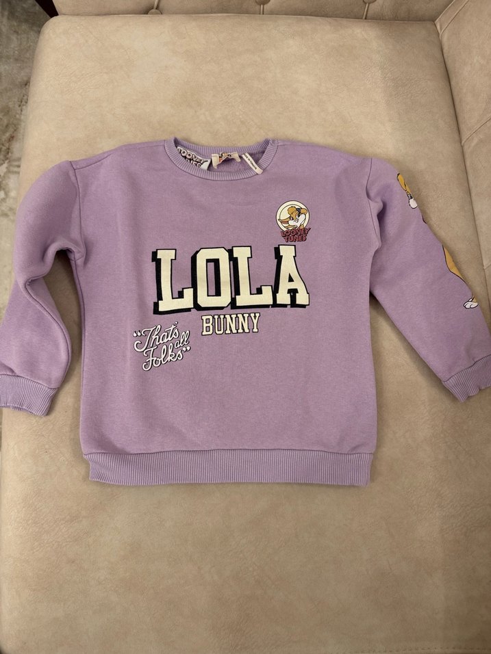 Pastel mor renkte, uzun kollu ve yuvarlak yakalı kız sweatshirtü. Yumuşak peluş kumaştan, baskılı , rahat kesim.