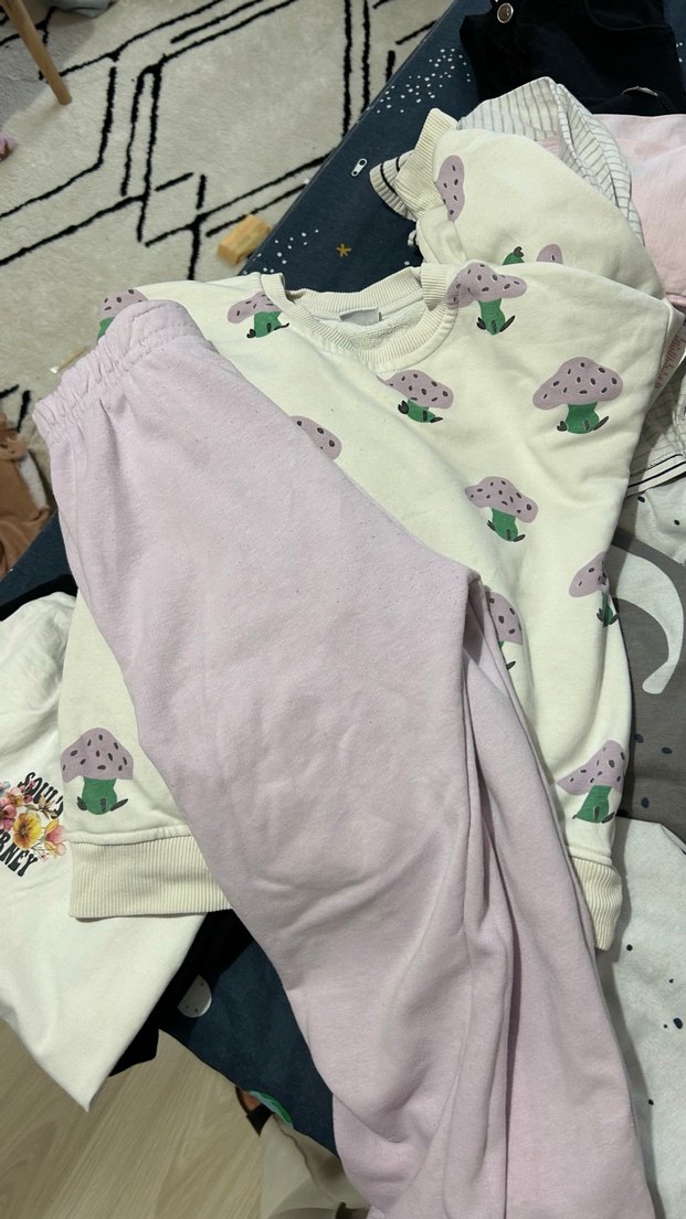 Mor baskılı sweatshirt ve pantolondan oluşan kız takımı, bol kesim, bisiklet yaka ve uzun kolludur. Pastel mor pantolon ve mantar desenli üst, retro ve bohem tarzı yansıtır. Yumuşak sentetik kumaş ve örme detaylara sahiptir.