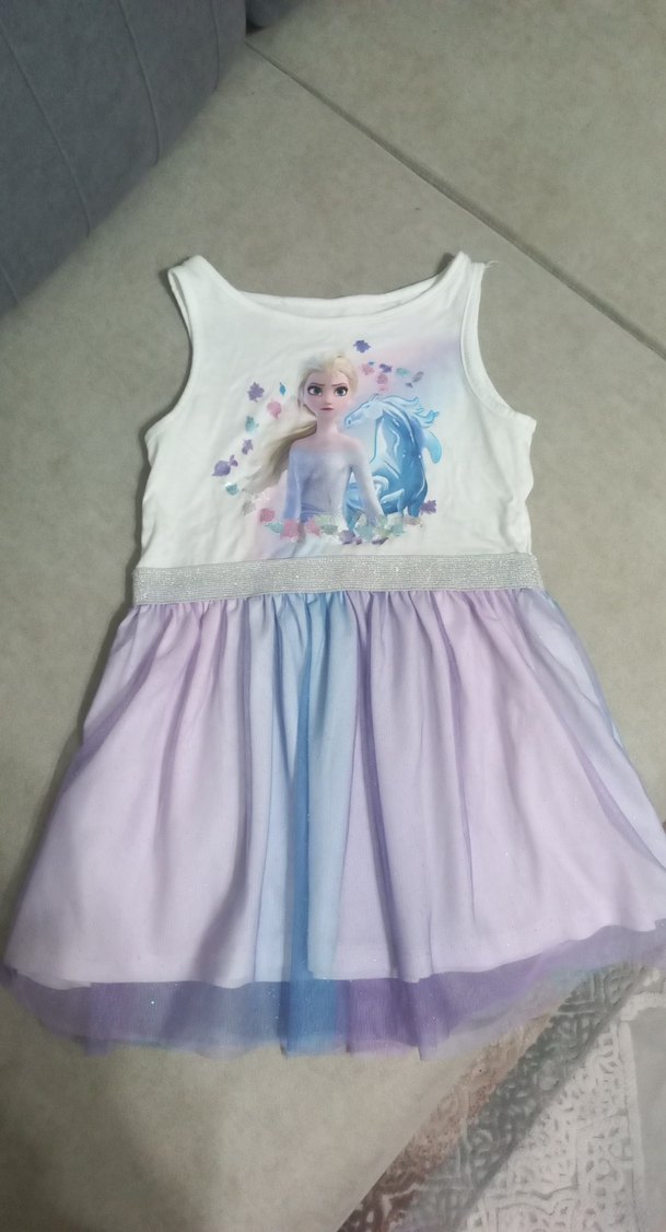 Kolsuz kız çocuk elbisesi, baskılı üst kısmı ve pastel mor, fırfırlı etek kısmıyla. Yumuşak sentetik kumaş.