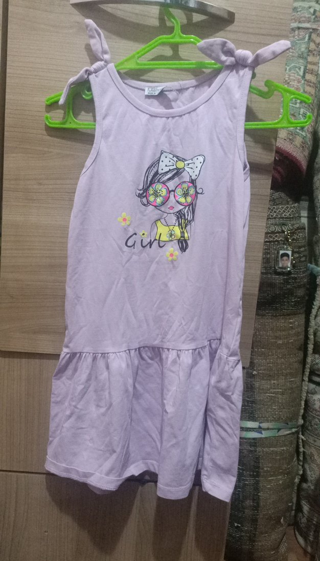 Kolsuz, bol kesim mor elbise, baskılı kız figürü ve etek kısmında fırfır detayına sahip. Yumuşak sentetik kumaştan, günlük kullanıma uygun.