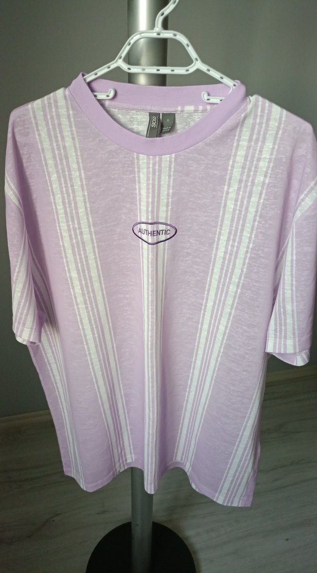 Pastel mor renkte, kısa kollu ve bisiklet yaka hamile tişörtü. Pamuklu, baskılı çizgiler ve AUTHENTIC yazısı ile rahat kesim.boy 72cm omuz 52cm dir.