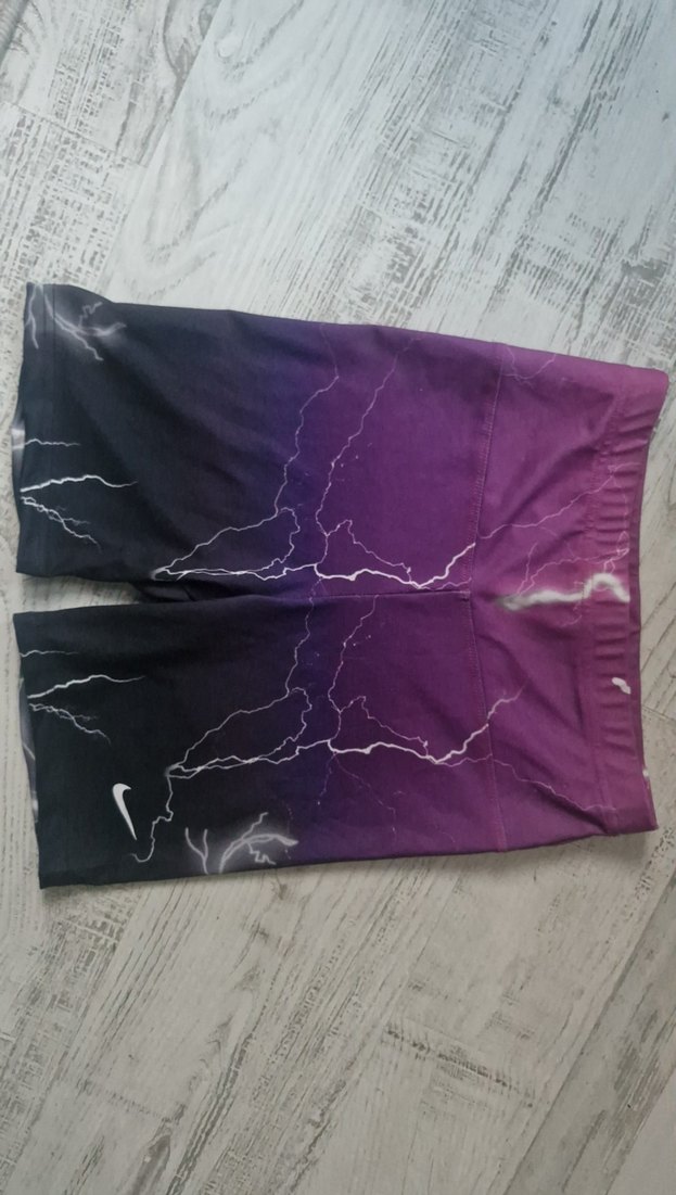 Koyu mor baskılı desenli, esnek sentetik kumaştan yapılmış, spor ve sokak stili için uygun, vücuda oturan kadın taytı. %100 pamuktur.