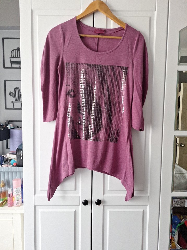Mor renkli, uzun kollu tişört. Salaş kesim, drapeli etek ucu ve baskılı ön yüzey içerir.