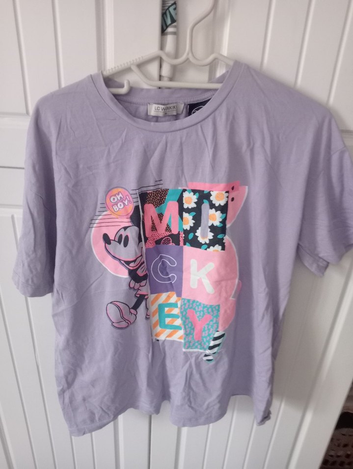 Pamuklu, rahat kesim, kısa kollu, bisiklet yaka kız tişörtü. Pastel mor renkte, baskılı desenli ve 'K', 'E' harfleri içerir.