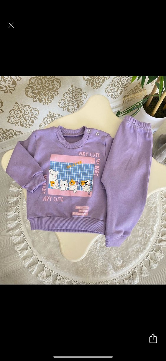 Pastel mor renkte, baskılı ve örgü dokulu uzun kollu bebek kıyafet seti. Üzerinde "VERY CUTE" yazılı sevimli hayvan figürleri bulunur.
