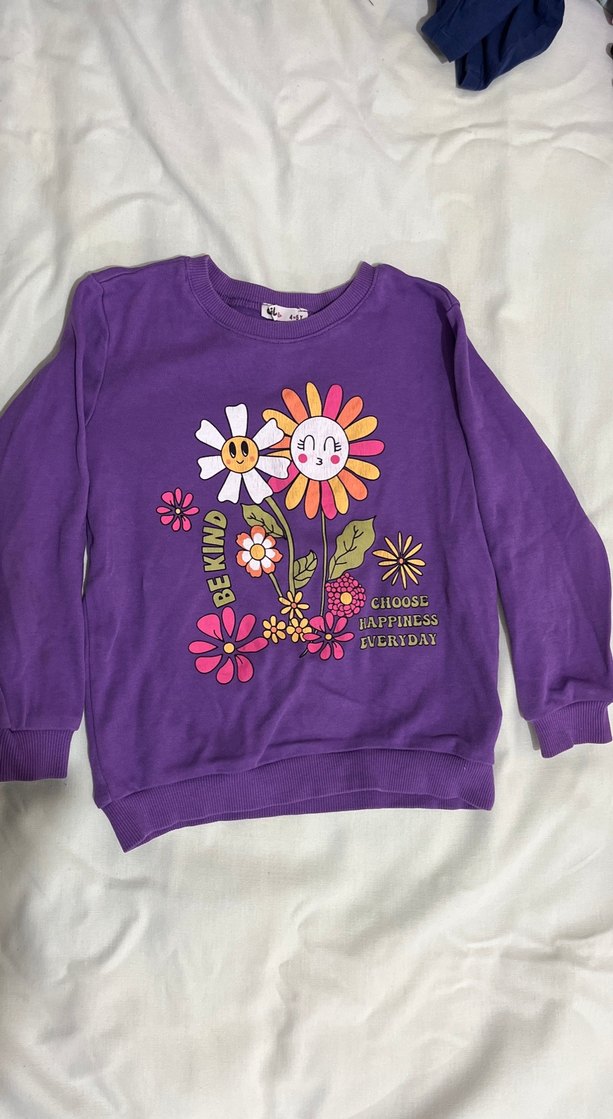 Mor renkli, canlı baskılı çiçek desenli kız sweatshirtü. Uzun kollu, yuvarlak yaka ve rahat kesimdir. Yumuşak kumaştan, düğme detaylıdır.