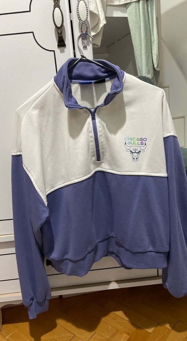Yarım fermuarlı, yüksek yakalı ve uzun kollu bol kesim sweatshirt. Yumuşak polar kumaştan, pastel mor ve krem renklerde, Chicago Bulls baskılıdır.