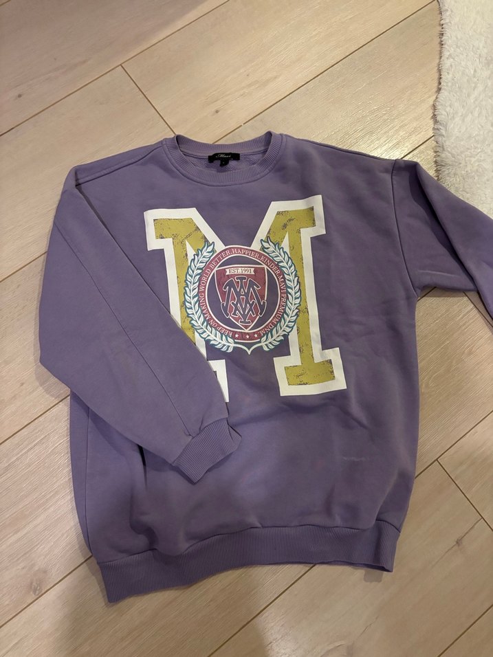 Mor renkli, uzun kollu, yuvarlak yaka, baskılı ve zincir detaylı rahat kesim sweatshirt. Yumuşak ve sıcak kumaştan, günlük kullanıma uygun.
