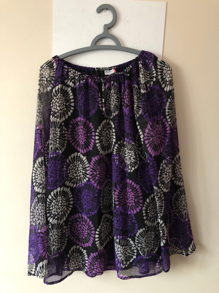 Mor batik desenli kadın bluzu, yuvarlak yaka ve bağcıklı detaylara sahiptir. İçi astarlıdır. Bol kesim ve şifon kumaştan üretilmiştir. Bohem tarz için uygundur. Birkaç kez kullanıldı. Hiçbir kusuru yoktur.
