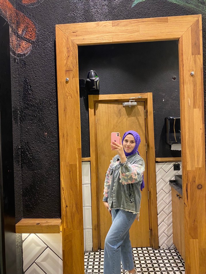 Mor batik desenli, uzun kollu ve boğazlı, fitted kesim kadın denim ceket. Rock punk tarzında günlük kullanıma uygundur.