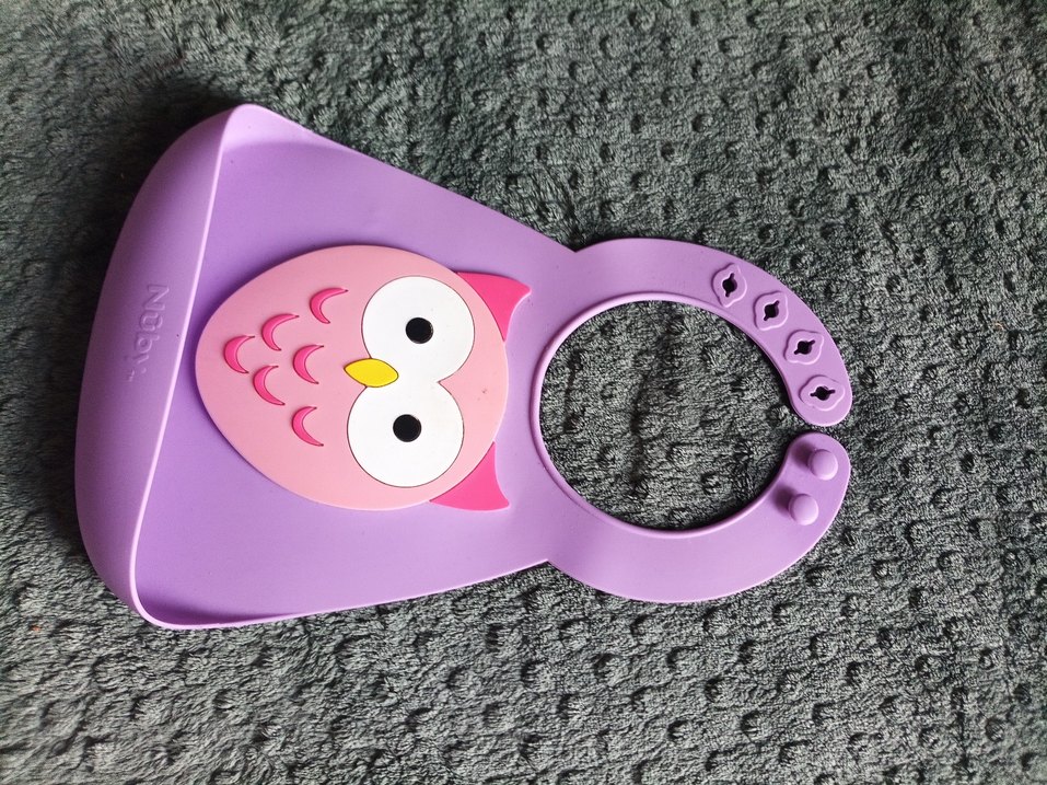 #takas var Mor renkli, baykuş desenli bebek önlüğü. Ayarlanabilir boyun kısmı ve kolay temizlenebilir malzemeden üretilmiştir.