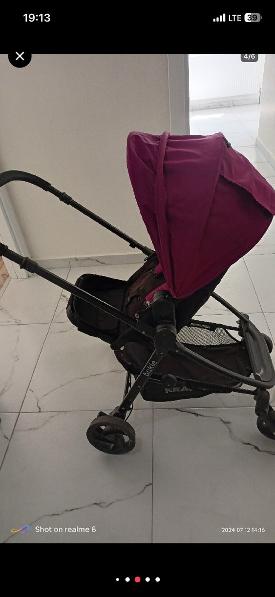 Koyu mor renkte bebek arabası, tente ve alt kısmında saklama sepeti ile kompakt tasarıma sahip. Puset ve portbebe büyük kısmı mevcut yağmurluklu kraft marka bebek arabası