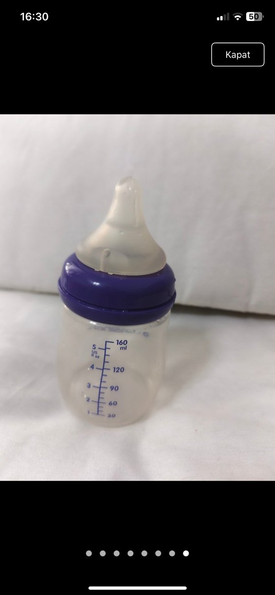 Mor kapaklı, 160 ml ölçülü renkli bebek biberonu. Sayılı kulanıldı tertemiz