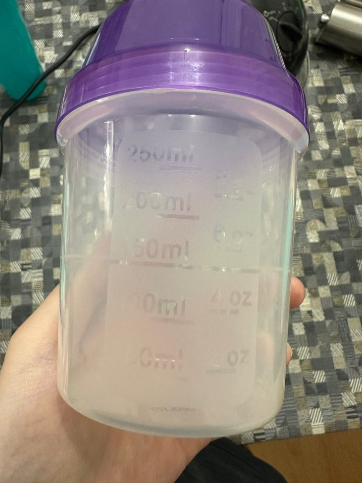 Pastel mor kapaklı, 250ml ölçü işaretli şeffaf bebek biberonu. Üzerinde 'Oml' yazısı bulunur.