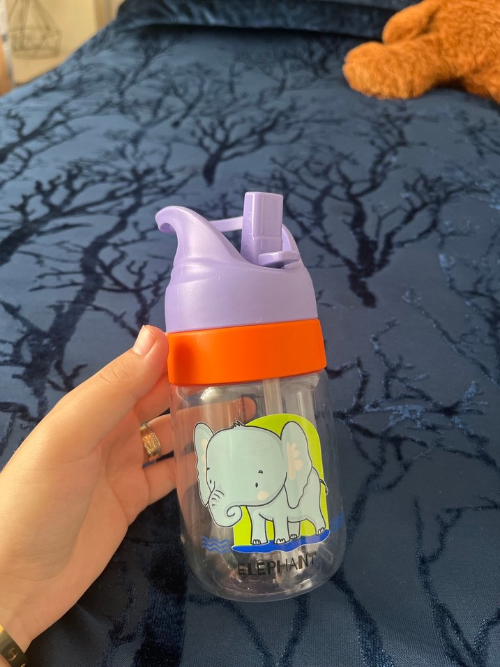 Pastel mor kapaklı, kullanışlı ağızlıklı ve turuncu tutma kısmı olan bebek biberonu. Üzerinde sevimli fil resmi bulunur.