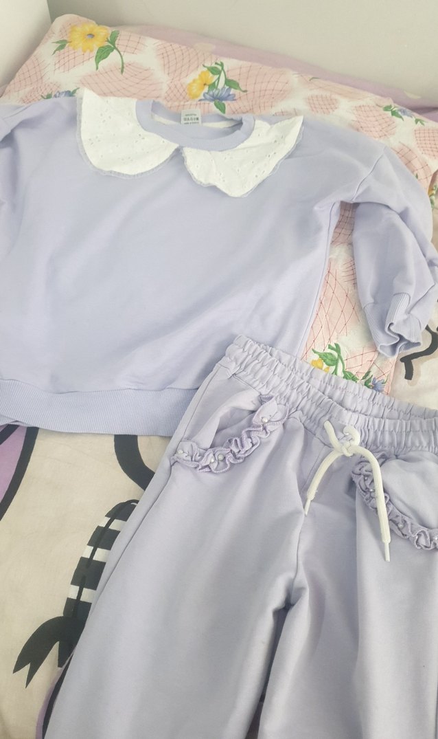 Pastel mor renkte, kısa kollu, nakışlı ve fırfır detaylı bebek kız takımı. Yumuşak ve rahat kumaştan yapılmıştır.