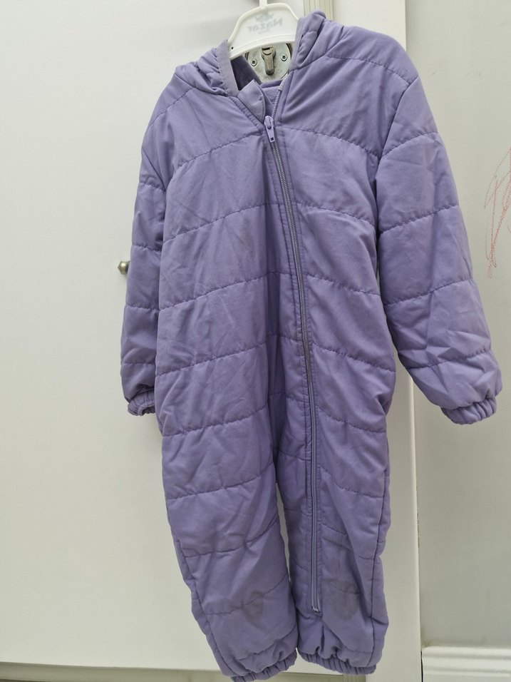 Mor renkli, kapüşonlu ve ön fermuarlı bebek kız tulumu. Dolgulu kumaşı soğuk havalarda sıcaklık ve konfor sağlar. Deseni düz ve yakası kesik yaka şeklindedir. rengi göründüğünden daha tatlı